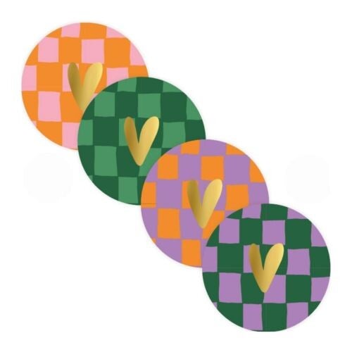 Vrolijk gekleurde stickers met een goud hart er op gedrukt zijn perfect om je cadeautjes, enveloppen of ansichtkaarten mee te versieren. Het blokjes patroon geeft de sticker net even iets extra's.