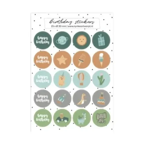 Stickervel met 20 'happy birthday' stickers in warme, groen, cogac en grijs tinten. De stickers hebben diverse afbeeldingen. Leuk om met deze stickers te werken in een fotoalbum of groeiboekje van je kleintje of om je cadeautjes mee te versieren.