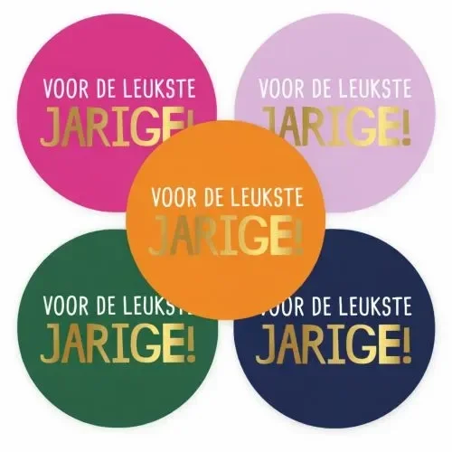 Feestelijke, ronde sticker met de tekst 'voor de leukste jarige' er op gedrukt. Deze sticker heeft 5 eigentijdse kleurvarianten. Zo heb je de keuze welke je mooi bij je cadeauverpakking vindt staan.